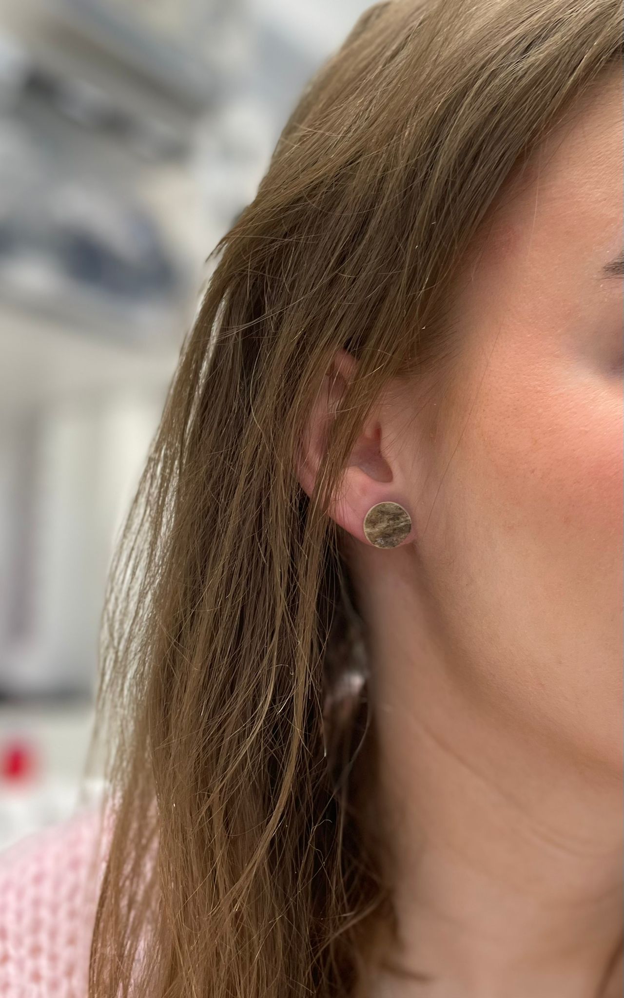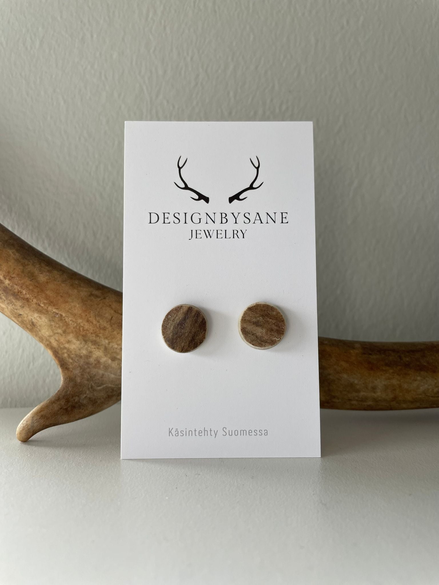 Poronsarviluusta käsityönä tehdyt nappikorvakorut.